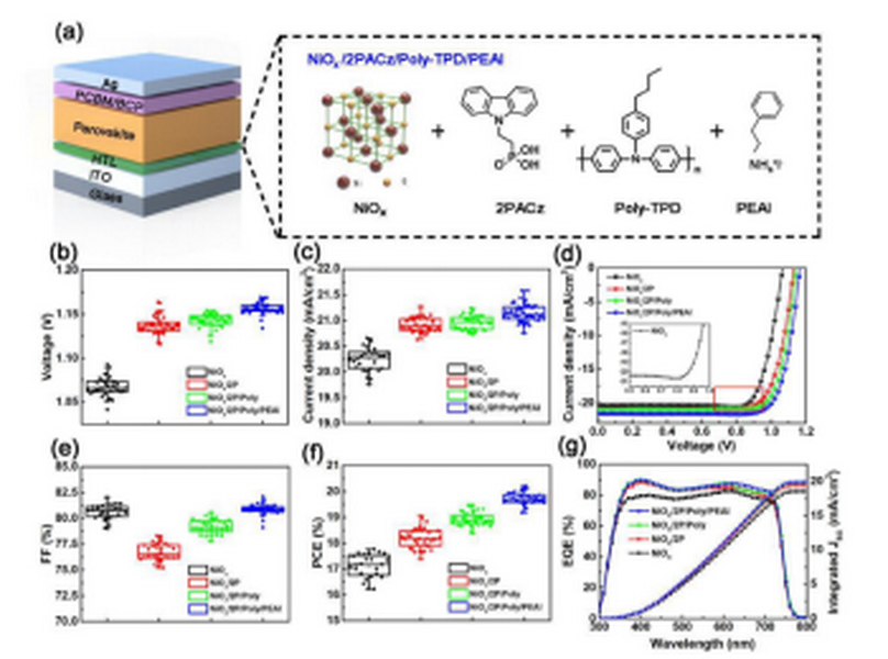 Fig. 1 (a) Schematic diagram of device structure of NiOX-based HTLs. (b-f) J-V curves of PSCs under AM 1.5 illumination. (g) IPCE spectra and integrated JSC under the AM 1.5 illumination