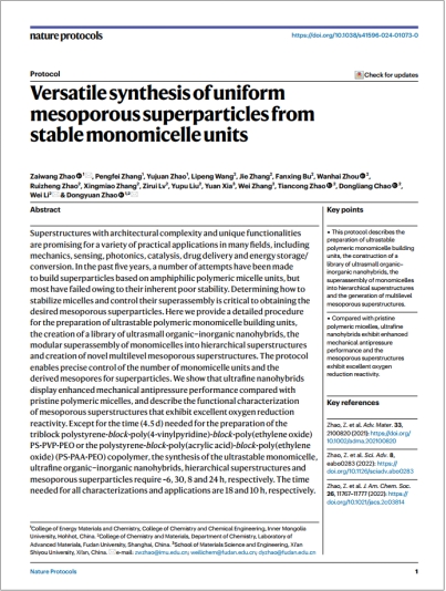 近日,葡京名誉校长、能源材料化学研究院院长赵东元院士和能源材料化学研究院赵再望研究员在Nature Protocols(方法学领域的顶级期刊)上发表了题为“Versatile synthesis of uniform mesoporous superparticles from stable monomicelle units”的科研论文。该论文系统介绍一种“超稳定”的聚合物单胶束组装基元,并以此为组装单元构筑了多种分级介孔超颗粒。
