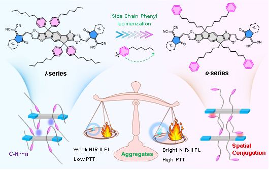 近红外二区(1000-1700 nm)有机光诊疗剂具有较低的自发荧光干扰,可以大大提升荧光成像的组织穿透深度和分辨率,在生物医学领域具有广阔的应用前景。由于这类光诊疗剂绝大部分为疏水性分子,因此通常需要将其包覆成纳米粒子进行使用,这就使得它们的光物理性质不仅取决于分子结构本身,还与分子的聚集行为密切相关。然而,由于分子聚集行为的多样性、敏感性和复杂性,通过精确的分子结构改造来调控分子的聚集行为,进而获得具有理想光物理性能的近红外二区有机光诊疗剂仍具有极大的挑战。通常,改变侧链的长度、位置和支化程度可以改变分子的扭转程度来实现光诊疗剂性能的调控。然而,利用侧链芳基位置来控制侧链与共轭主链间的相互作用强度,进而改变光诊疗剂的聚集行为和调控光诊疗性能的策略在很大程度上却未被探索。