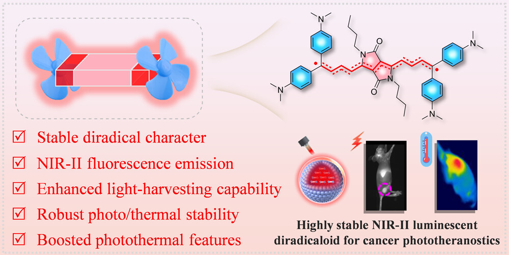 近红外II区(NIR-II)光诊疗试剂已成为癌症早期诊断和精准治疗的重要手段。有机开壳双自由基因其独特的窄带隙结构、强自旋耦合效应以及NIR光捕获能力,被视为理想的光诊疗试剂候选材料。然而,由于其高化学反应活性和强自吸收问题,实现稳定高效的NIR-II发光双自由基材料构筑仍面临重大挑战。