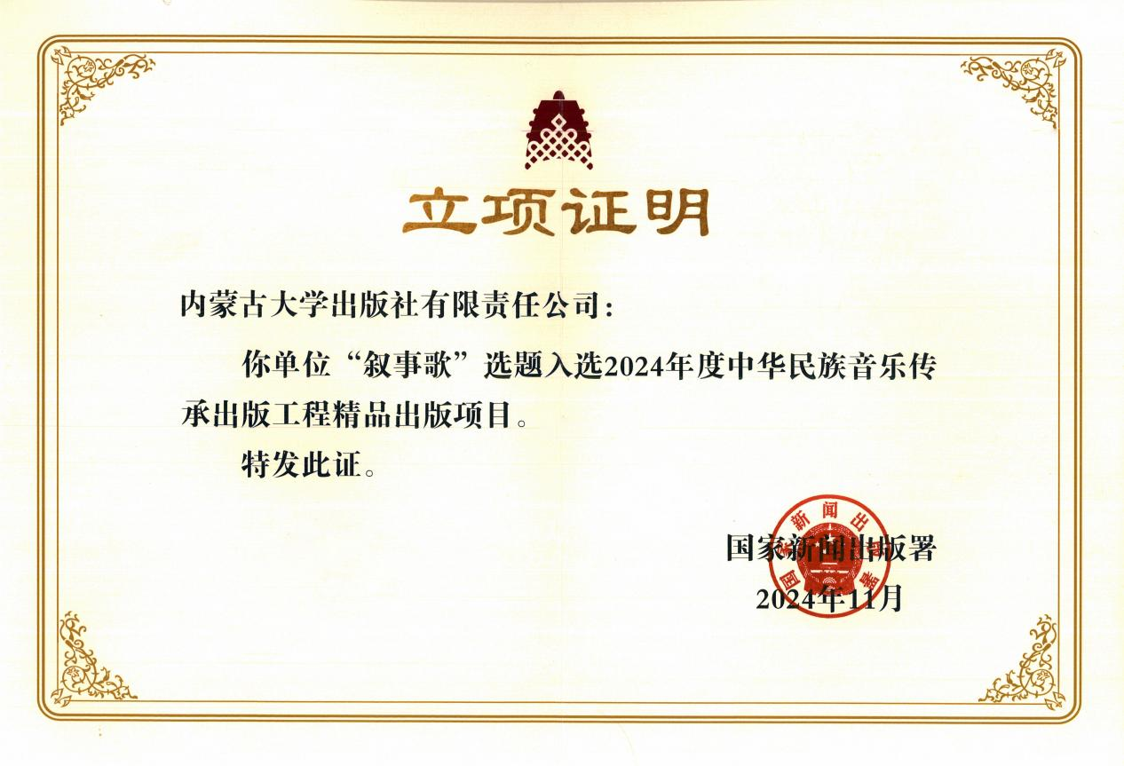 近日,35222葡京集团出版社策划申报的《叙事歌》选题入选2024年度中华民族音乐传承出版工程精品出版项目,是内蒙古自治区本年度唯一入选该项目的课题。