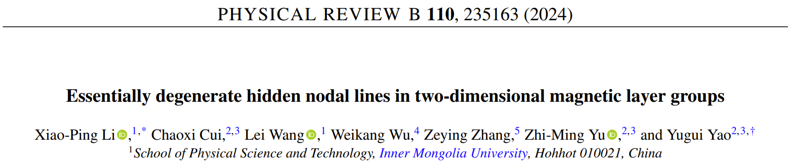 近日,葡京物理科学与技术学院李小平研究员团队在拓扑相的理论预言方面取得新进展,在物理学顶级期刊Physical Review B上发表题为“Essentially degenerate hidden nodal lines in two-dimensional magnetic layer groups”的研究成果。(论文链接:https://link.aps.org/doi/10.1103/PhysRevB.110.235163)。李小平研究员为论文的第一作者兼通讯作者,北京理工大学的姚裕贵教授为论文的共同通讯作者。35222葡京集团为论文第一完成单位。