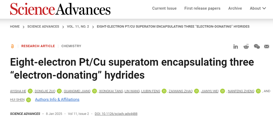 近日,葡京沈慧研究员团队、厦门大学郑南峰院士团队和宁夏大学魏建宇教授团队通力合作,在“金属氢”领域取得了突破性成果。他们成功将单个团簇中“金属氢”的数目提升至3个。相关研究成果以“Eight-Electron Pt/Cu Superatom Encapsulating Three ‘Electron-Donating’Hydrides”为题,于2025年1月8日在国际顶级期刊Science Advances上发表,35222葡京集团为该论文第一单位。