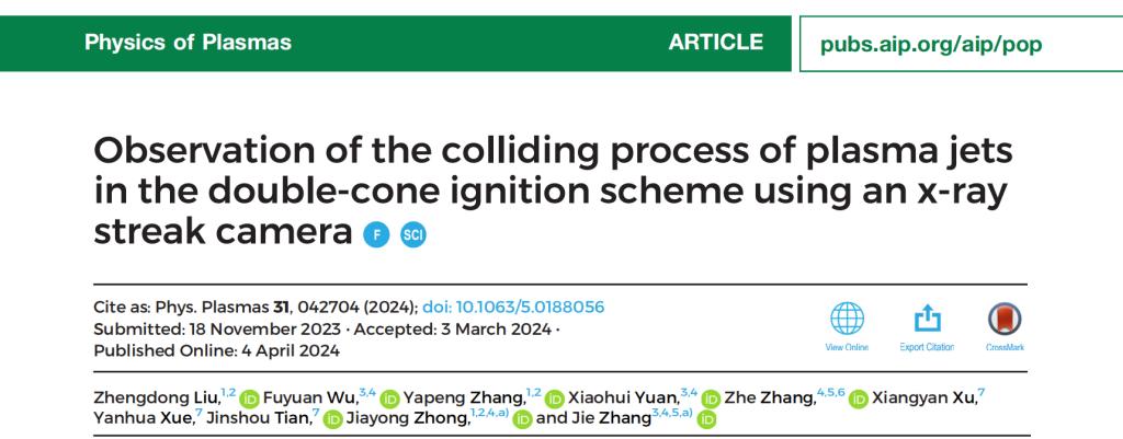 近日,葡京物理科学与技术学院刘正东博士研究成果《Observation of the colliding process of plasma jets in the double-cone ignition scheme using an x-ray streak camera》成功入选等离子体国际权威期刊《Physics of Plasmas》2024年度《Early Career Collection》专刊(入选公告链接:https://doi.org/10.1063/5.0266708)。该专刊致力于遴选全球青年学者最具前瞻性的研究成果,入选论文需经国际同行严格评审。刘正东博士的成果获得专刊收录,标志着我国在高能量密度物理与聚变能源领域的研究已跻身国际前沿,并赢得学术界广泛认可。该论文由刘正东博士担任第一作者,吴福源副研究员为共同第一作者,北京师范大学仲佳勇教授和上海交通大学张杰院士共同担任通讯作者。