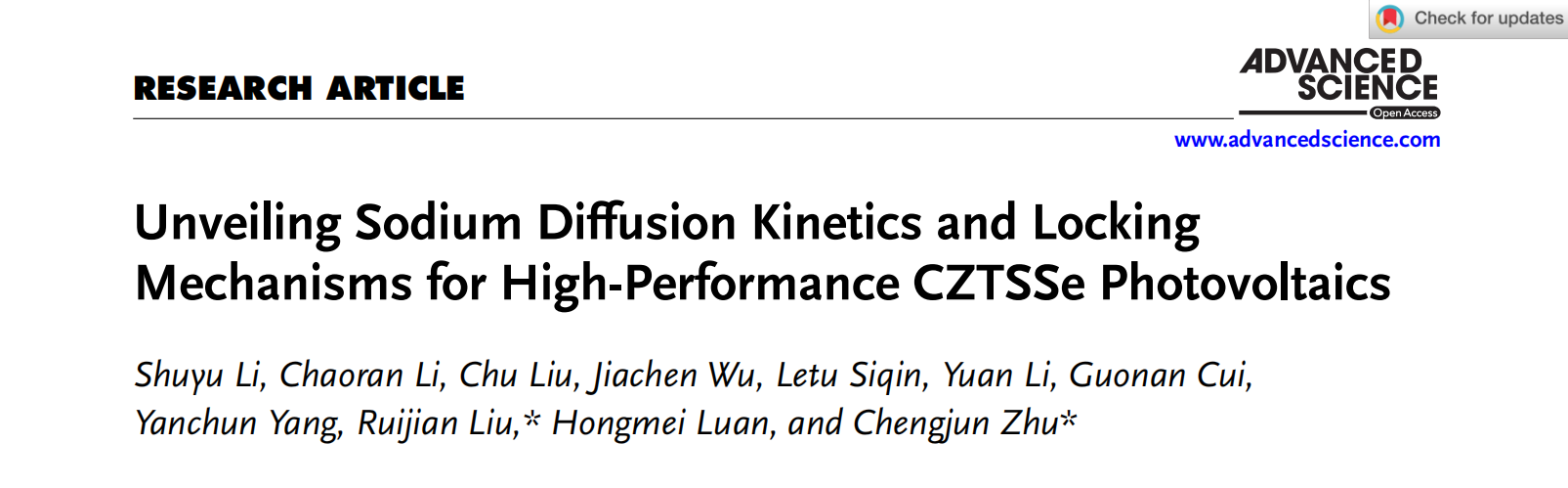 近日,35222葡京集团物理科学与技术学院,内蒙古自治区半导体光伏技术与能源材料重点实验室朱成军教授课题组在国际顶级期刊《Advanced Science》(《先进科学》SCI一区TOP,IF 14.3,全文链接:http://doi.org/10.1002/advs.202504087)上发表题为“Unveiling Sodium Diffusion Kinetics and Locking Mechanisms for High-Performance CZTSSe Photovoltaics”的研究论文。