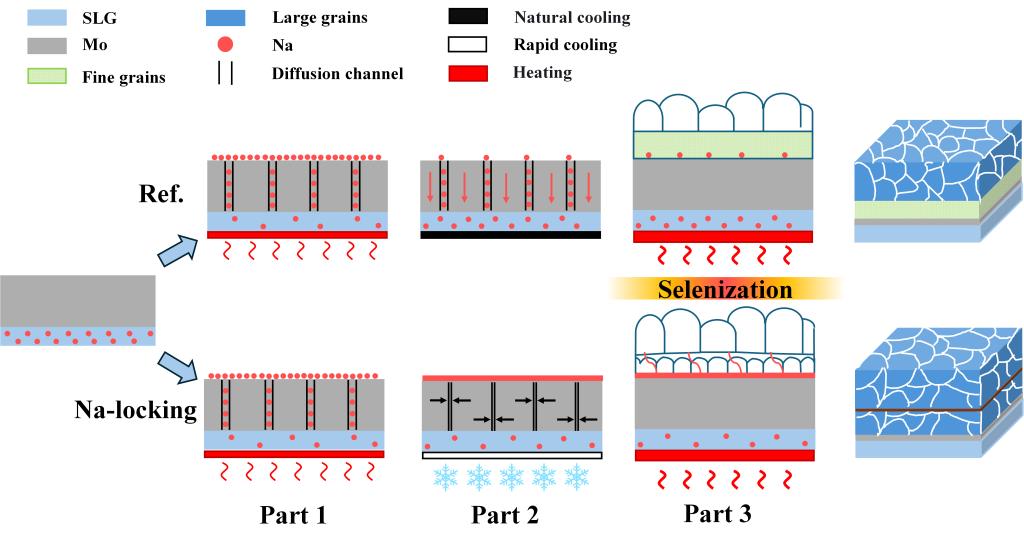 采用Na锁定策略和传统方法制备的CZTSSe中晶粒生长机制的比较示意图
