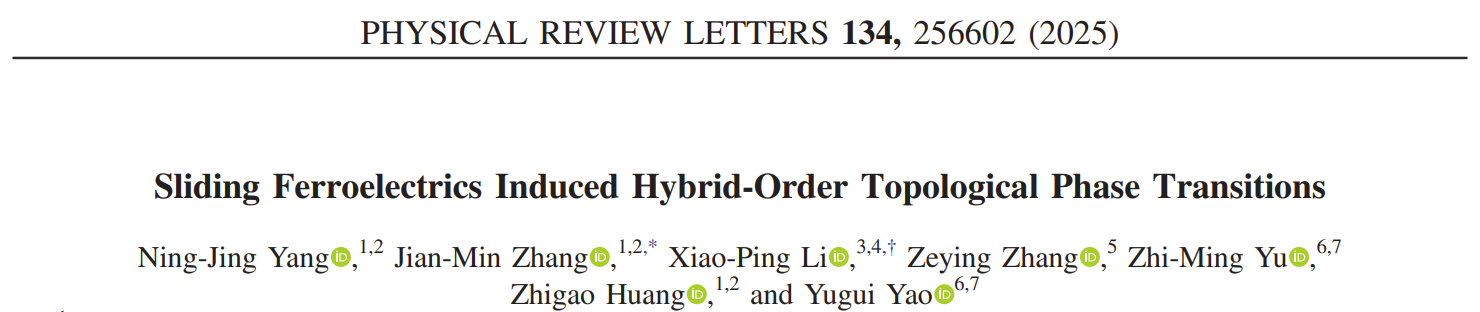 近日,葡京物理科学与技术学院李小平研究员团队在铁电操控拓扑量子态方面取得重大突破,在物理学顶级期刊Physical Review Letters上发表题为“Sliding Ferroelectrics Induced Hybrid-Order Topological Phase Transitions”的研究成果。(论文链接:https://journals.aps.org/prl/pdf/10.1103/l1n5-1jsm)。李小平研究员为该论文的通讯作者,福建师范大学的张健敏教授为文章的共同通讯作者。