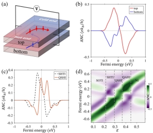 文章以二维二阶磁性拓扑绝缘体(SOTI)为研究对象,运用上述理论方案,发现该体系在经历铁电滑移后,会呈现出一种此前未被报道的自旋依赖的拓扑绝缘相。文章将其命名为自旋混合阶拓扑绝缘体(SHTI)。在这一独特的拓扑相中,自旋向上(顶层)和自旋向下(底层)的通道分别展现出一阶和二阶拓扑特性[见图2]。不仅如此,通过调节系统参数,量子自旋霍尔绝缘体、量子反常霍尔绝缘体以及平庸绝缘体等其他传统的拓扑相也能够出现。文章进一步提出,这些拓扑相的反常能斯特效应存在显著差异[见图3],可作为实验探测的信号,为实验验证提供了切实可行的方案。