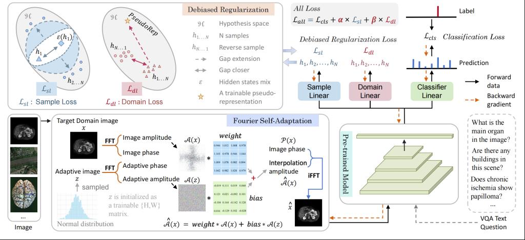 工作简介:通用预训练模型已成为各个领域的重要支撑,但其在特定领域的迁移仍面临挑战。现有方法多依赖源域数据进行分布对齐,且大多聚焦于单一任务,限制了模型的泛化能力与应用范围。为解决这一问题,本文提出一种无需源数据的图像自适应方法,Fourier Self-Adaptation(FSA),旨在提升通用模型在多领域任务中的迁移能力。该方法充分利用傅里叶相位与幅度在语义与感知上的差异特性:相位含有高级的结构和位置信息,稳定性强;振幅则承载亮度与细节信息,易受领域漂移影响。FSA通过从高斯分布中初始化一个可学习的自适应图像,并与目标图像在频域进行幅度插值,其中插值比重由可学习weight和bias动态调节,实现对目标数据分布的动态对齐。同时,FSA引入去偏正则化机制,引导模型关注目标领域内在关系,剔除无关冗余表征。基于FSA框架,我们在11个图像分类任务和6个多模态视觉问答任务中开展评估,涵盖放射学、病理学、遥感、艺术等多个专业领域。实验结果表明,FSA在多个数据集上均显著优于基础预训练模型,性能提升幅度达1%至8%,验证了其在复杂领域迁移场景中的广泛适用性与领先性能。