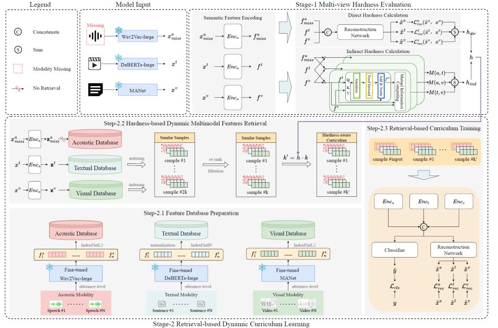 工作简介:缺失模态处理已成为多模态情感识别(MER)领域的关键研究方向。传统方法通常通过缺失模态重构来解决该问题,但这些方法未能考虑不同样本重构难度的差异性,导致模型难以有效处理困难样本。为突破此局限,本文提出新型难度感知动态课程学习框架HARDY-MER。该框架分两阶段运作:首先评估各样本的难度等级,继而在训练中策略性强化困难样本的学习,以提升模型处理挑战性实例的能力。具体而言,我们创新性提出:1)多视角难度评估机制,通过综合考量直接难度(模态重构误差)与间接难度(跨模态互信息)量化重构难度;2)基于检索的动态课程学习策略,通过检索语义相似样本并平衡难易样本的学习权重,动态调整训练课程。在基准数据集上的大量实验表明,HARDY-MER在缺失模态场景下始终优于现有方法。