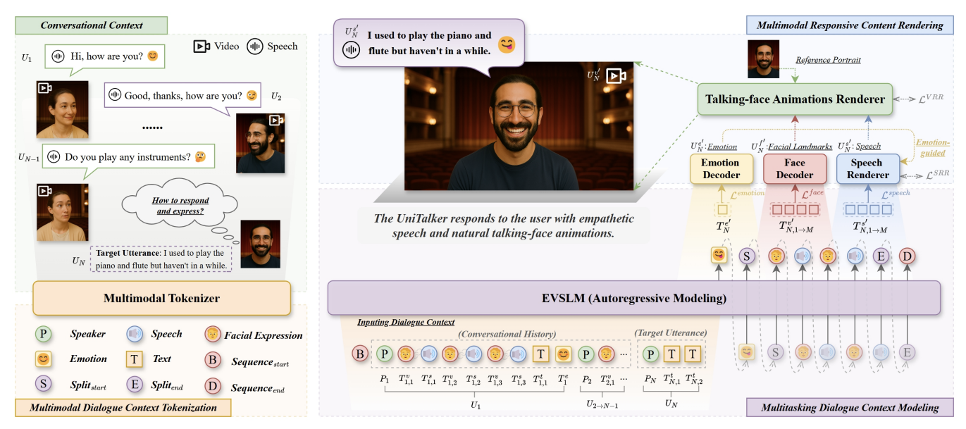 工作简介:对话式语音合成(CSS)作为人机交互领域的核心任务,旨在为用户生成更具表现力与共情力的语音。然而现实人际交流中,"用心倾听"与"视觉交互"对情感传递起着关键作用。现有CSS研究仅能感知对话上下文中的文本与语音,其效果存在局限,纯语音响应模式更制约了交互体验。为突破这些限制,本文提出对话式音视频合成(CSVS)任务作为传统CSS的扩展,通过利用文本、语音、视觉多模态对话上下文,为用户提供连贯的音视频响应。为此,我们开发了名为UniTalker的CSVS系统——这是一个集多模态感知与多模态渲染能力于一体的统一模型。该系统基于大语言模型全面理解对话上下文中的多模态线索(包括说话者、文本、语音及说话人脸动画),继而通过多任务序列预测,先推断目标话语情感,再生成共情语音与自然的说话人脸动画。为确保生成的音视频内容在情感、内容和时长上保持同步,我们提出三项关键优化:1)设计专用的Landmark Codec量化和重建面部表情序列;2)提出双模态音视频硬对齐解码策略;3)在生成阶段实施情感引导渲染。主客观实验表明,本模型合成的语音更具共情力,并为用户提供更自然、情感更一致的说话人脸动画。